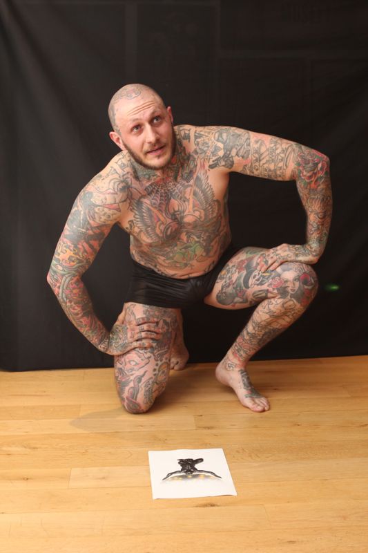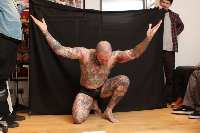 Beau Brady was in town for the Brighton Tattoo Convention last weekend. We were chatting about the film and he joked that I could have him parody the classic Atlas pose. It was a funny conversation and I thought it was a great idea.